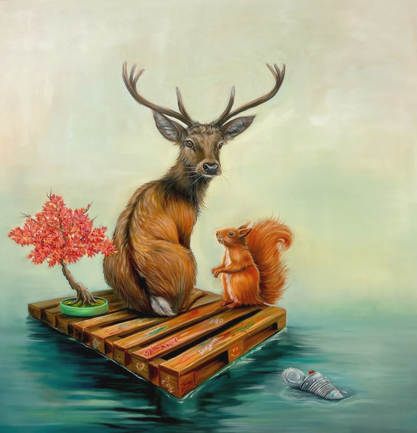 Upon a pallet, rough and old,Where graffiti's stories bright unfold,A deer and squirrel, side by side,With dreams of adventure, gently glide.